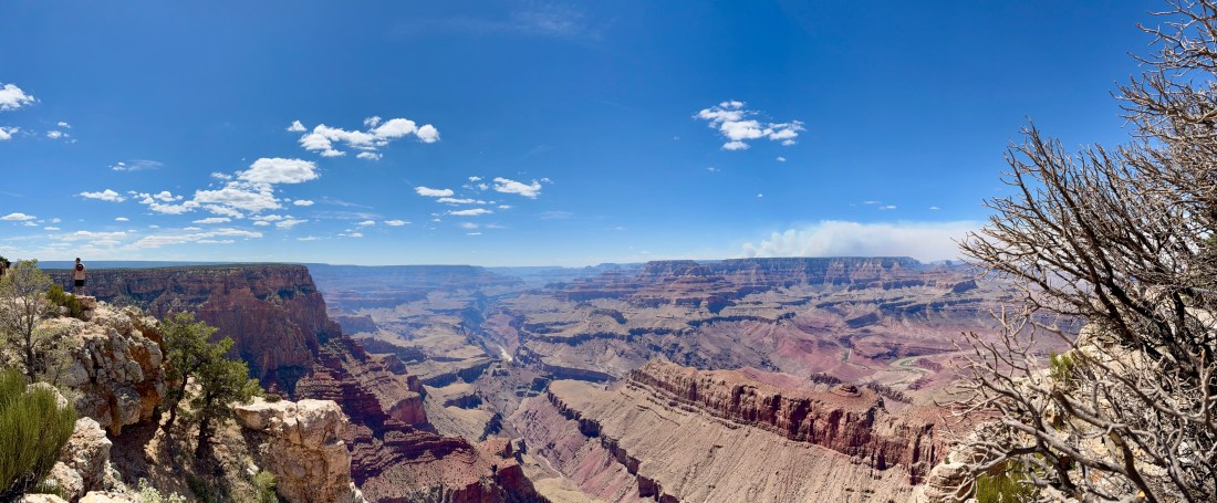 Tuesday morning started bright and early, a bit brighter and earlier than usual, as we were heading for the Big Ditch, the Grand Canyon. I had reserved spaces for us on an all-day tour with Canyon Dave Tours, a company that comes highly recommended for good reason. Our guide, Keaton, picked us up at our hotel in Flagstaff at 7:45 a.m. in a 10-(or so)-passenger van with the plan to pick up another couple in Wilson and another in the Grand Canyon National Park. That would be our entire tour group! We would see vistas and historically significant buildings and points of interest all along the South Rim, working our way around to the East Rim. Lunch was included. Keaton turned out to be a perfect tour guide with a wealth of knowledge on the canyon’s geology, flora and fauna, Native American habitations, and National Park history. Pretty much anything you would want to know about the Grand Canyon, Keaton had an answer. Plus, he was genuine and engaging with a good sense of when to jump in and when to leave space. At day’s end, Keaton drove us all back to where we belonged to the strains of Carlos Nakai, famed Native American flute virtuoso. Of our landmark tours, this was the most expensive, but it was also worth every dollar. But enough about the process. Let’s talk about the Canyon.