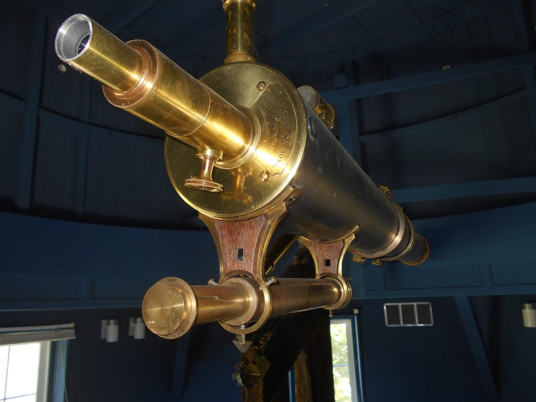 The rough-hewn stone building is not large compared to others on campus, but stands two and a half stories and contains a planetarium and a museum, and it is crowned with a wooden rotating cylinder (acting like a modern observatory dome) that houses an historic telescope. That telescope, a 7″ diameter refractor, is the first one made professionally by Alvin Clark, the legendary American telescope maker of the 19th century who completed his career with the famous, world-record holding 40″ refractor at the Yerkes Observatory on Lake Geneva in Wisconsin. (The Yerkes is on my list for August.) I am told Clark left his job to build the Hopkins refractor in 1851.