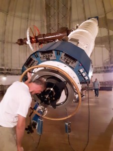 After we observed the six objects, they brought the lights up and a bunch of us took pics with the scope. I got someone to take a couple of me, one looking at the camera and one looking into the eyepiece. The second is a pretty stupid picture, of course, because (1) the lights were on (2) the dome was closed (3) the scope was no longer even pointed at the shutters, all of which is plainly apparent. Oh well. The first one is a good picture. The evening ended pretty unceremoniously. I don’t remember if anyone even said, “Good night, thanks for coming.” It was just okay, that’s it, here’s the stair down to the door. Scientists are not always sentimental.